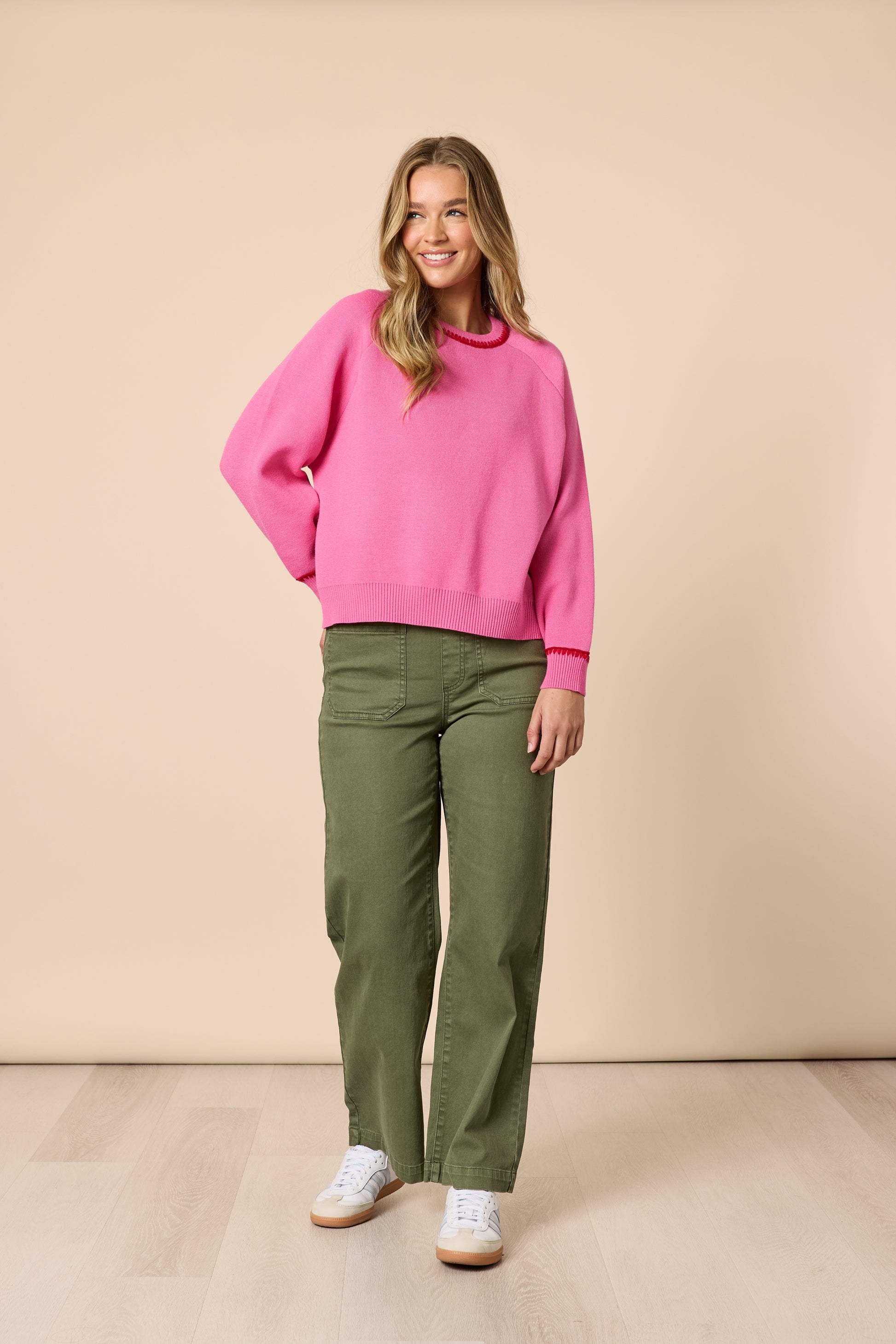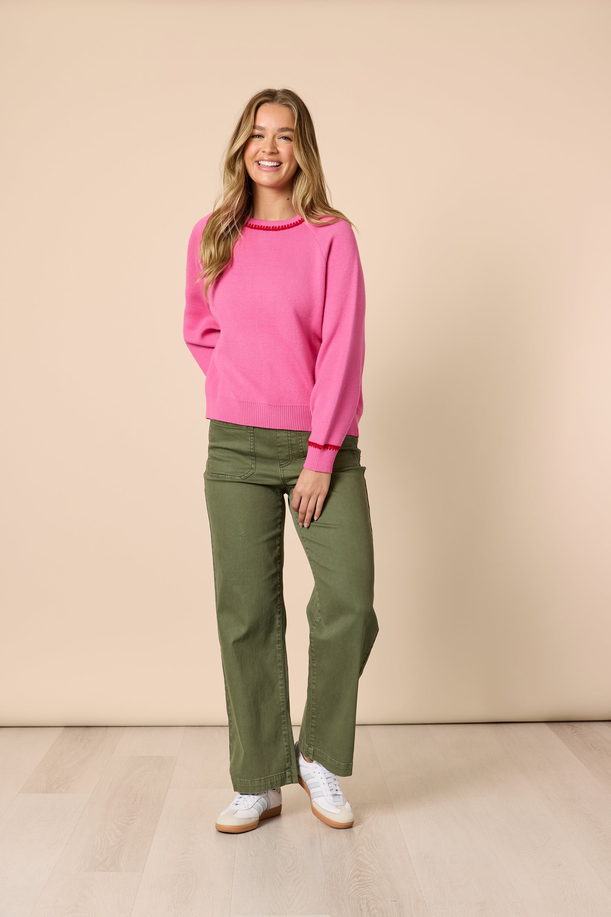 - Crafted from a soft, mid-weight knit, this jumper features delicate contrast stitching around the neckline and cuffs, adding a handcrafted feel and a subtle pop of personality.