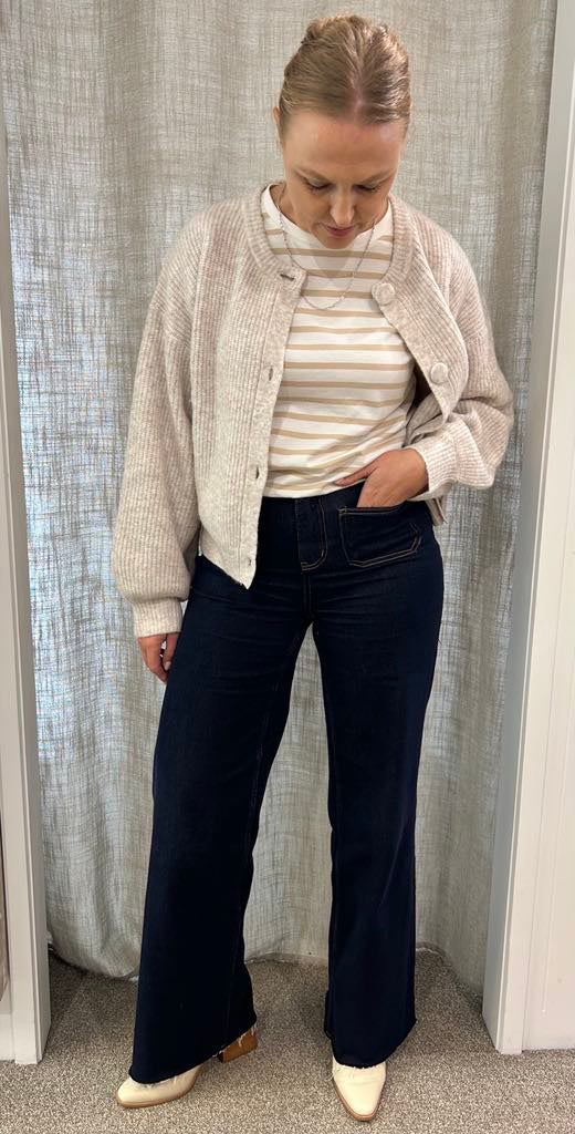 Our favourite jean in soft, stretch denim, on trend pockets at the front and back. Dark denim with a raw hem that can either be cut to length or taken up if needed. Come and try, you wont be disappointed.