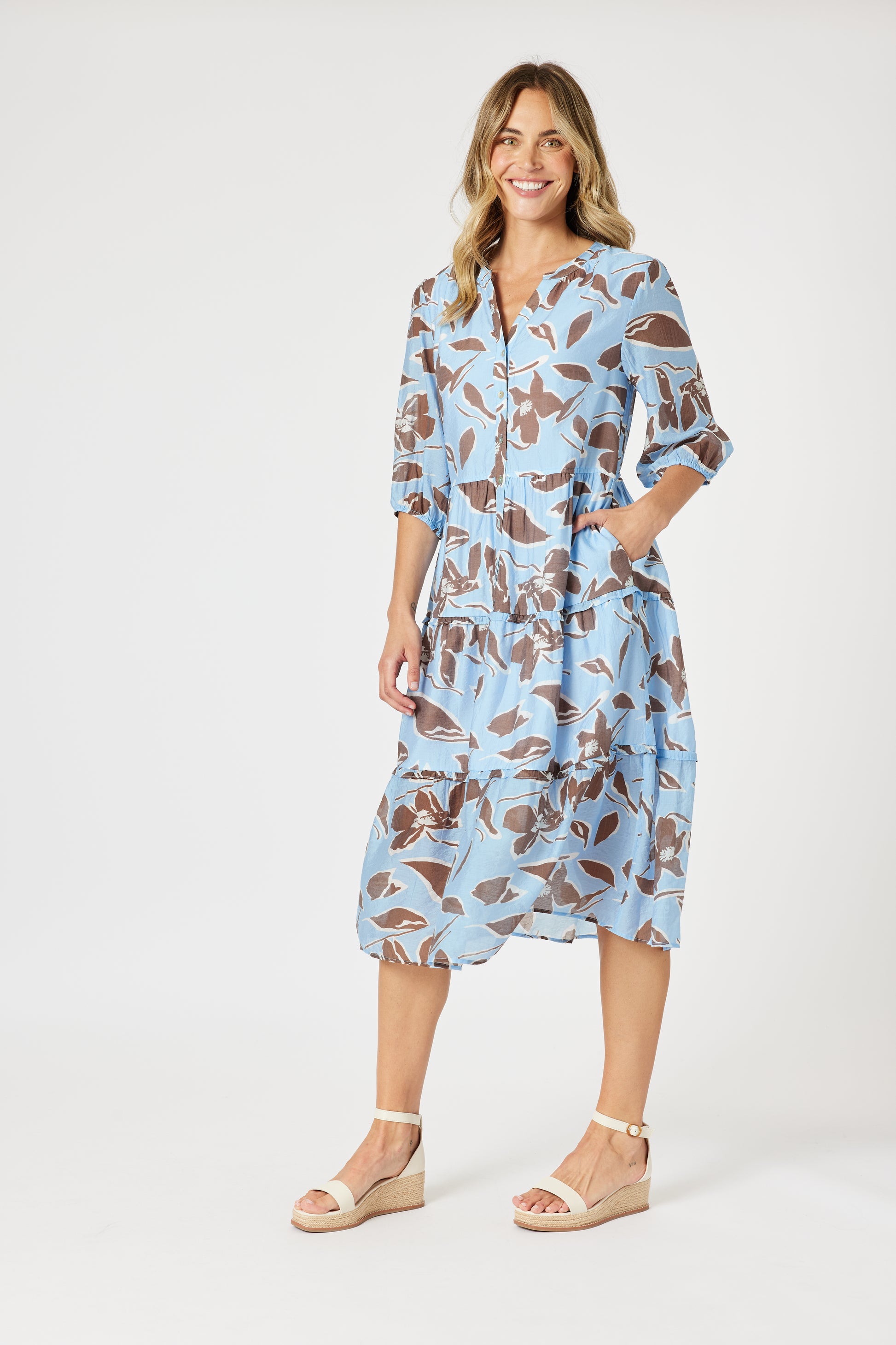 - Featuring a soft sky-blue base with bold brown florals, this midi dress is crafted from lightweight fabric with a breathable cotton lining through the body for all-day ease