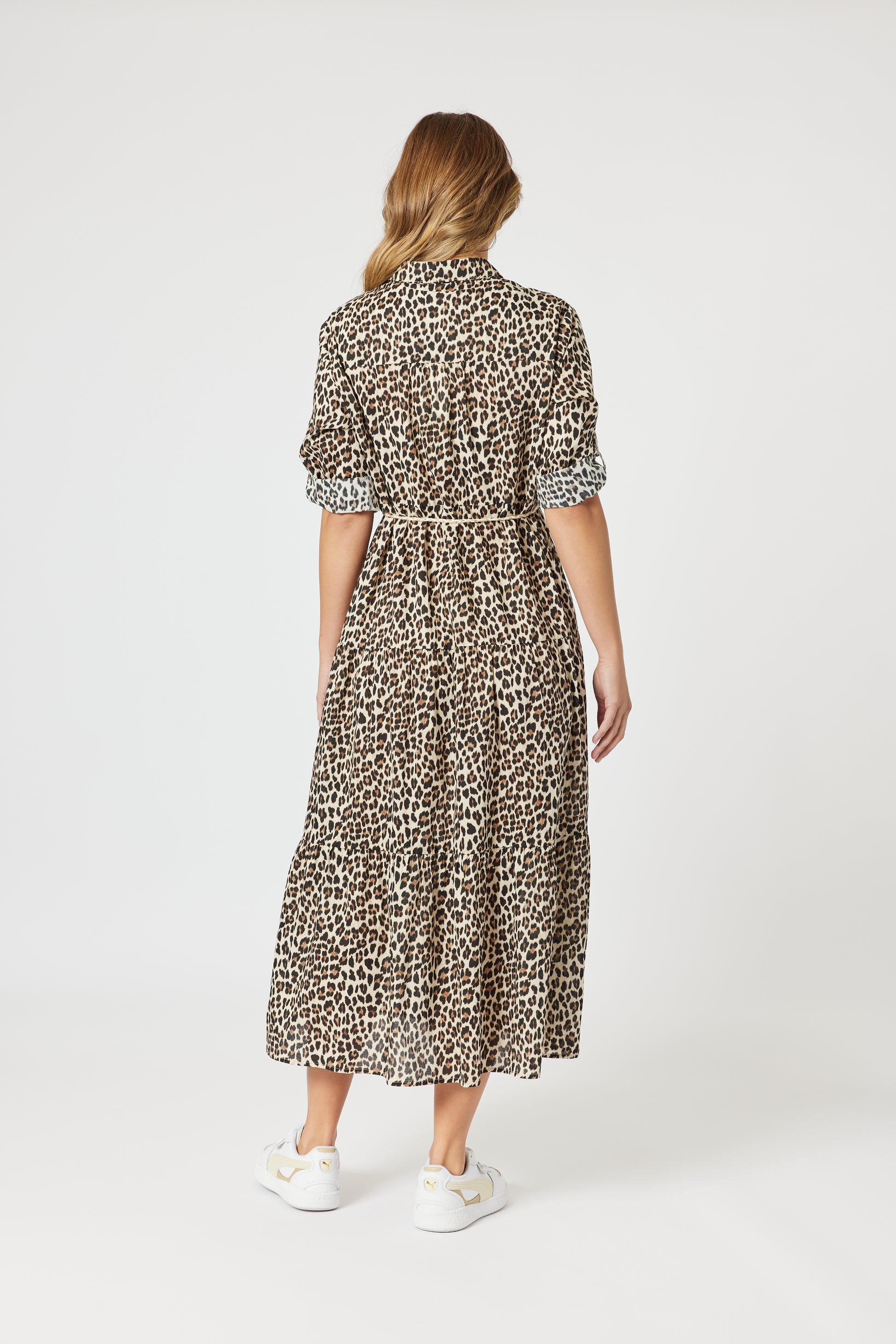 - It features a collared neckline, button-through front, tab up sleeves for multiple sleeve length options and removable rope fabric belt with tassels.