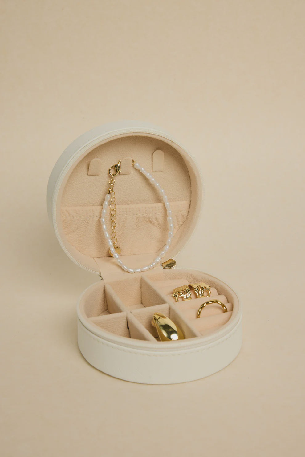 Keep your jewellery safe and organised in this playful Round White Jewellery Travel Case. Its compact size and circular design make it perfect for on-the-go accessorising. No more tangled bracelets or lost earrings while traveling!